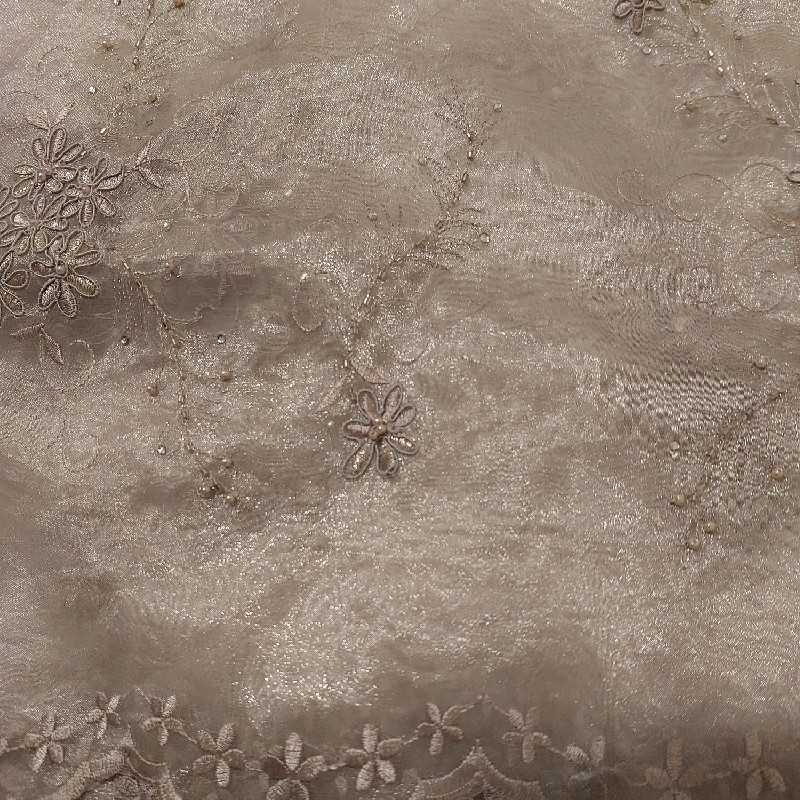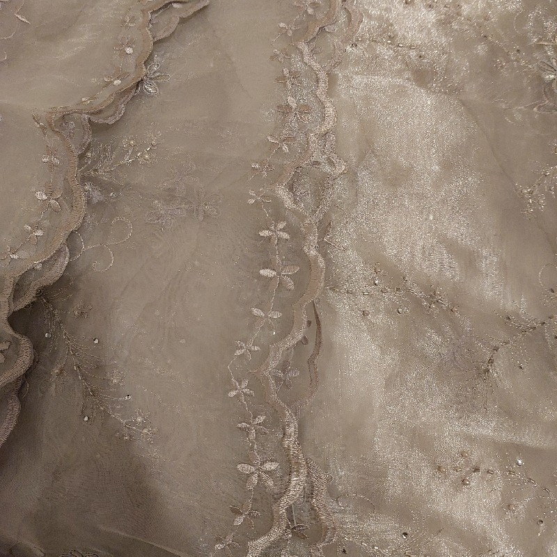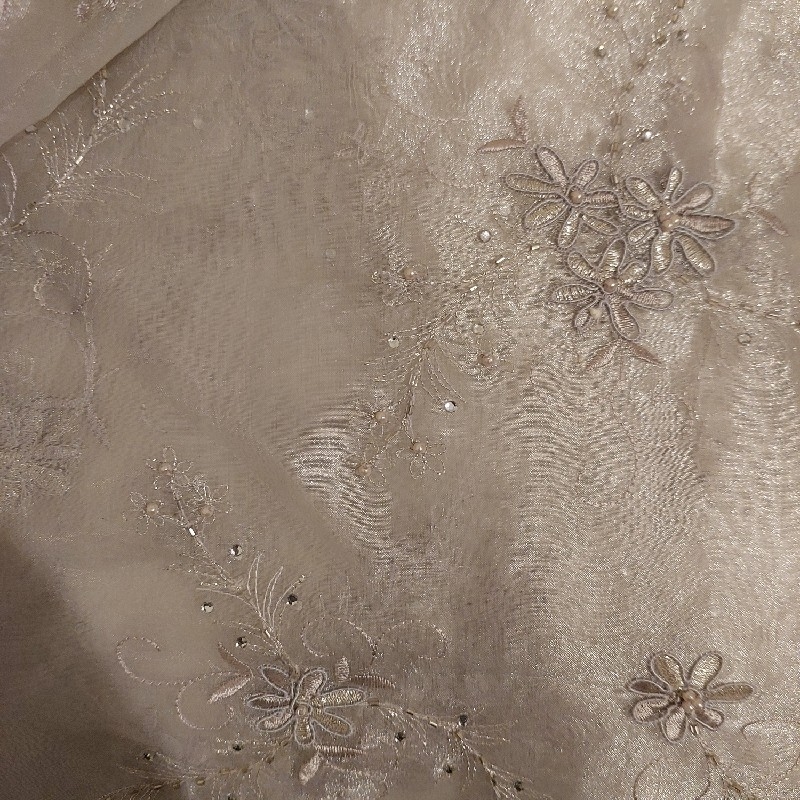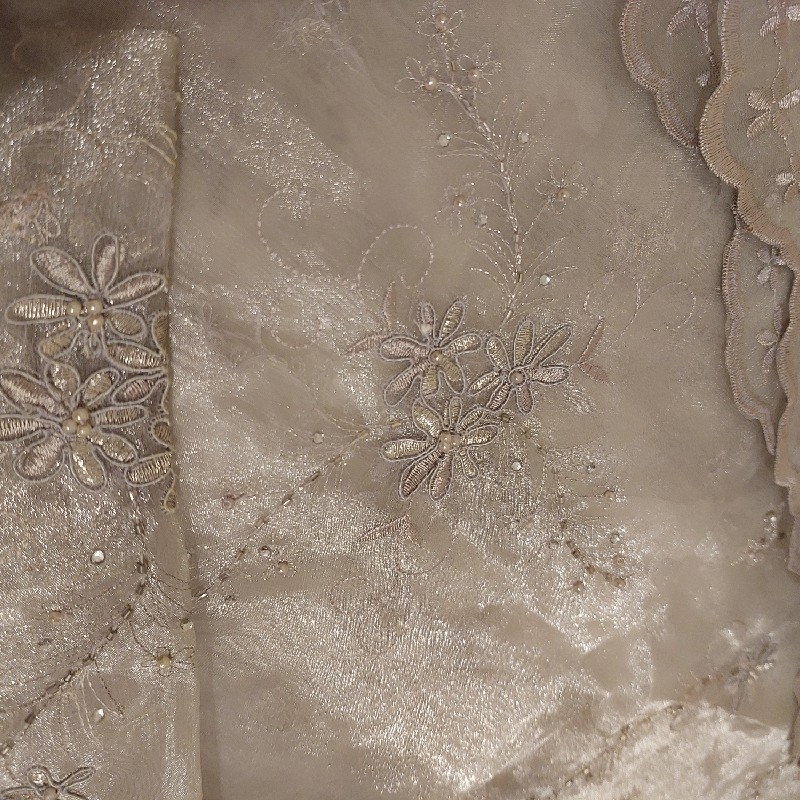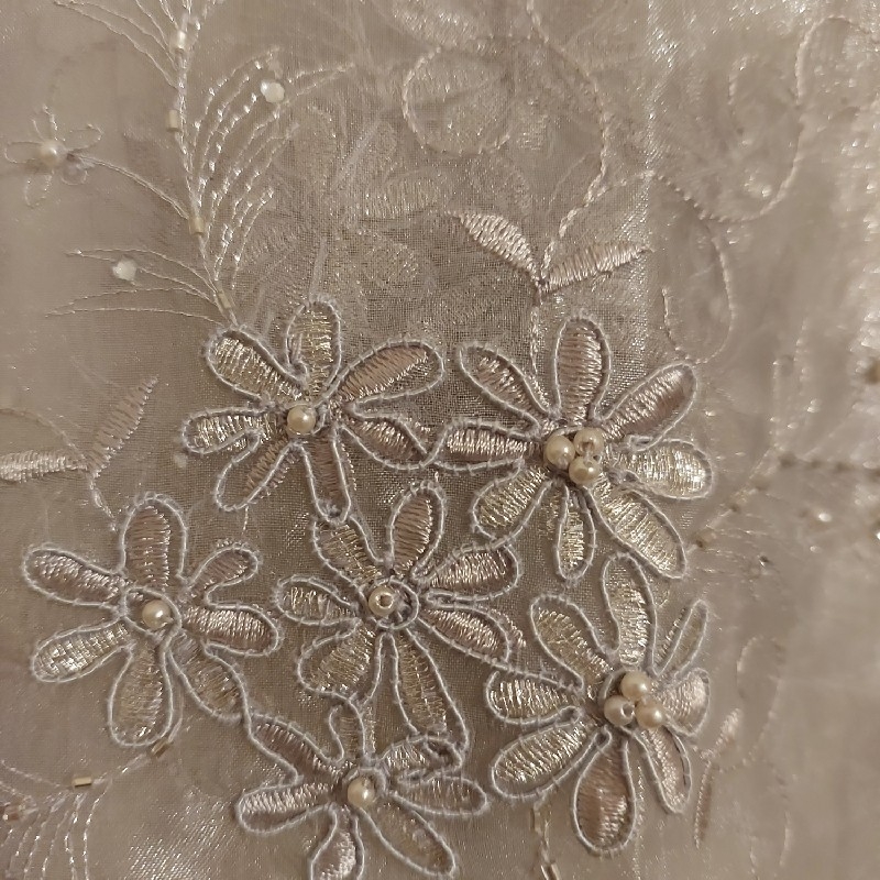 پارچه مجلسی سنگ و مروارید دوزی شده + آستری اندازه ۱۵۰ × ۱۵۰ رنگ نقره ای معاوضه هم دارم با طلا یا سکه طلا